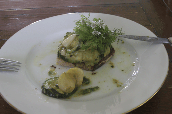 Courgette flowers—reproductive organs removed—eaten raw in a salad, added to a frittata, tempuraed as I mentioned here and here or stuffed and shallow fried as I mentioned here. The thing to remember is that it is perfectly all right to remove the female flowers to eat while the fruit is growing and also the male flowers that grow on a thin stem that will not turn into a fruit. Leaving them around for pollinating purposes is only required if you are looking to save seeds.